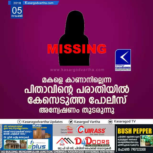 മകളെ കാണാനില്ലെന്ന പിതാവിന്റെ പരാതിയില് കേസെടുത്ത പോലീസ് അന്വേഷണം തുടരുന്നു