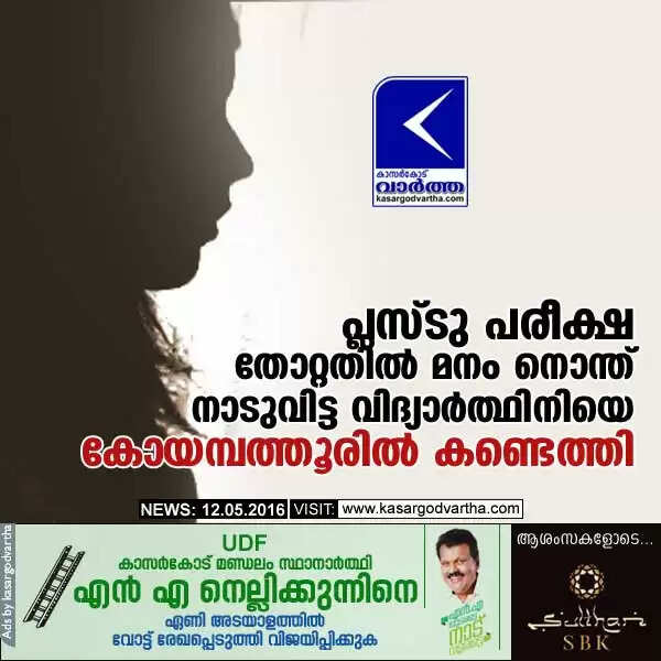 പ്ലസ് ടു പരീക്ഷയില്‍ തോറ്റതില്‍ മനം നൊന്ത് നാടുവിട്ട വിദ്യാര്‍ത്ഥിനിയെ കോയമ്പത്തൂരില്‍ കണ്ടെത്തി