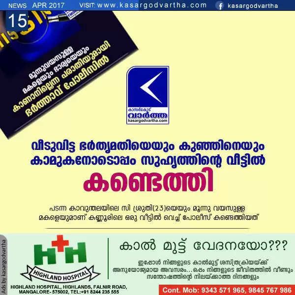 പടന്ന: (www.kasargodvartha.com 15/04/2017) വീടുവിട്ട ഭര്തൃമതിയെയും കുഞ്ഞിനെയും കാമുകനോടൊപ്പം സുഹൃത്തിന്റെ വീട്ടില് കണ്ടെത്തി. പടന്ന കാവുന്തലയിലെ സി ശ്രുതി(23)യെയും മൂന്നു വയസുള്ള മകളെയുമാണ് കണ്ണൂരിലെ ഒരു വീട്ടില് വെച്ച് പോലീസ് കണ്ടെത്തിയത്.