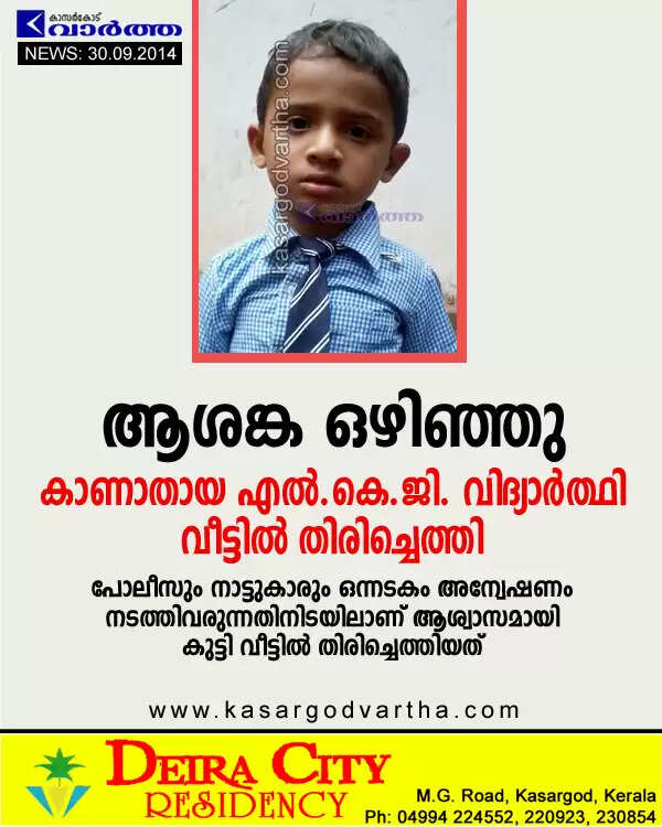 കാണാതായ എല്.കെ.ജി. വിദ്യാര്ത്ഥി വീട്ടില് തിരിച്ചെത്തി