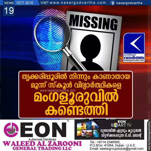തൃക്കരിപ്പൂരില് നിന്നും കാണാതായ മൂന്ന് സ്കൂള് വിദ്യാര്ത്ഥികളെ മംഗളൂരുവില് കണ്ടെത്തി