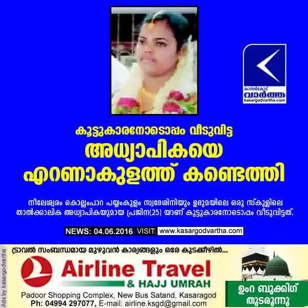 നീലേശ്വരം: (www.kasargodvartha.com 04.06.20160 കൂട്ടുകാരനോടൊപ്പം വീടുവിട്ട അധ്യാപികയെ എറണാകുളത്ത് കണ്ടെത്തി. നീലേശ്വരം കൊല്ലംപാറ പയ്യംകുളം സ്വദേശിനിയും ഉദുമയിലെ ഒരു സ്‌കൂളിലെ താല്‍ക്കാലിക അധ്യാപികയുമായ പ്രജിന(25) യാണ് കൂട്ടുകാരനോടൊപ്പം വീടുവിട്ടത്. ജൂണ്‍ രണ്ടിനാണ് അധ്യാപികയെ കാണാതായത്. പിന്നീടു നടത്തിയ അന്വേഷണത്തിലാണ് കൂട്ടുകാരനോടെപ്പം പോയതാണെന്ന് വ്യക്തമായത്.