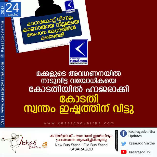 കാസര്‍കോട്: (www.kasargodvartha.com 24.04.2018) മക്കള്‍ സംരക്ഷിക്കാത്തതിലുള്ള മനോവിഷമത്തെ തുടര്‍ന്ന് നാടുവിട്ട് മലപ്പുറത്ത് മതപഠന കേന്ദ്രത്തില്‍ കണ്ടെത്തിയ വയോധികയെ കോടതിയില്‍ ഹാജരാക്കി. ചട്ടഞ്ചാലിലെ തിമ്മി (65)യെയാണ് ഫസ്റ്റ് ക്ലാസ് മജിസ്ട്രേറ്റ് കോടതിയില്‍ ഹാജരാക്കിയത്. കോടതി സ്വന്തം ഇഷ്ടത്തിനു വിട്ടതിനെ തുടര്‍ന്ന് ഇവര്‍ പിന്നീട് നീലേശ്വരത്തെ ബന്ധുവിനൊപ്പം പോയി.