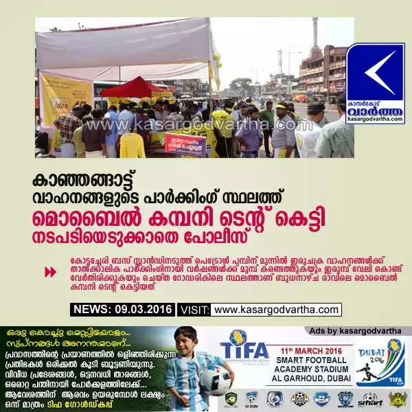 കാഞ്ഞങ്ങാട്: (www.kasargodvartha.com 09/03/2016) നഗരത്തില് വാഹനങ്ങളുടെ പാര്ക്കിംഗ് സ്ഥലത്ത് മൊബൈല് കമ്പനി ടെന്റ് കെട്ടി. പോലീസ് എയ്ഡ്പോസ്റ്റിന് മുന്നിലെ ഈ കയ്യേറ്റം പോലീസ് കണ്ടില്ലെന്ന് നടിക്കുന്നു. സാധാരണക്കാരന് കുടുംബം പോറ്റാന് വഴിയോരത്ത് കച്ചവടം നടത്തുന്നതിനെ കണ്ണില്ച്ചോരയില്ലാതെ മുടക്കുന്ന അതേ അധികാരികളാണ് ഇവിടെ വന് കിട കമ്പനിയുടെ കയ്യേറ്റത്തിന് മുന്നില് മൗനം പാലിക്കുന്നത്.