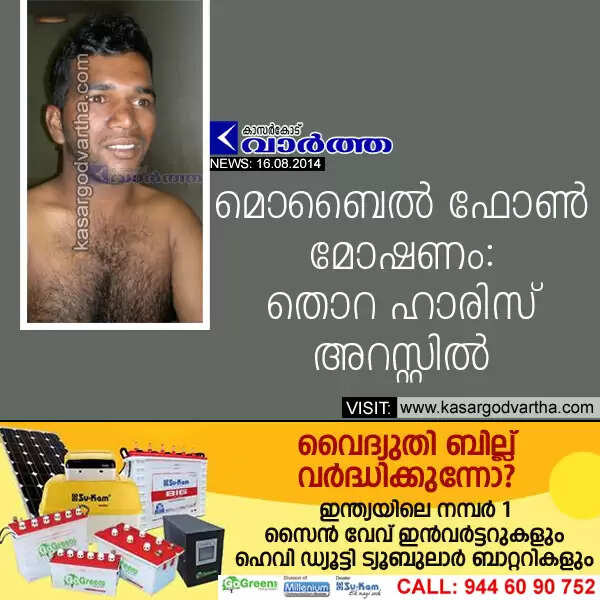 കാസര്‍കോട്: (www.kasargodvartha.com 16.08.2014) മൊബൈല്‍ ഫോണ്‍ മോഷ്ടാവ് പെര്‍ള സുല്‍ത്താന്‍ നഗറിലെ ഹാരിസ് എന്ന തൊറ ഹാരിസിനെ(25) ടൗണ്‍ അഡീഷണല്‍ എസ്.ഐ. കെ.ആര്‍.അമ്പാടിയുടെ നേതൃത്വത്തില്‍ അറസ്റ്റു ചെയ്തു. കാസര്‍കോട്, മഞ്ചേശ്വരം, വിദ്യാനഗര്‍, പോലീസ് സ്‌റ്റേഷന്‍ പരിധിയില്‍ നടന്ന നിരവധി മൊബൈല്‍ ഫോണ്‍ മോഷണക്കേസുകളില്‍ പ്രതിയാണ് ഹാരിസ്.
