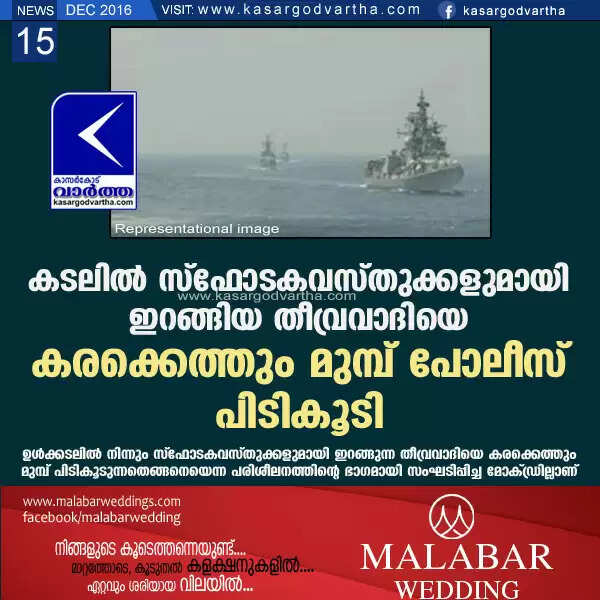 കാസര്‍കോട്: (www.kasargodvartha.com 15/12/2015) കടലില്‍ സ്‌ഫോടകവസ്തുക്കളുമായി ഇറങ്ങിയ തീവ്രവാദിയെ കാസര്‍കോട്ട് പോലീസ് സാഹസികമായി പിടികൂടി. ഇതൊരു സംഭവമല്ല. മറിച്ച് ഉള്‍ക്കടലില്‍ നിന്നും സ്‌ഫോടകവസ്തുക്കളുമായി ഇറങ്ങുന്ന തീവ്രവാദിയെ കരക്കെത്തും മുമ്പ് പിടികൂടുന്നതെങ്ങനെയെന്ന പരിശീലനത്തിന്റെ ഭാഗമായി സംഘടിപ്പിച്ച മോക്ഡ്രില്ലാണ്.