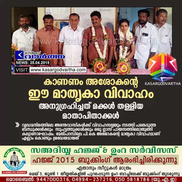 മേല്പറമ്പിലെ പി.കെ അശോകന്റെ മാതൃകാ വിവാഹമാണ് എല്ലാം കൊണ്ടും ശ്രദ്ധേയമായത്. പരവനടുക്കം വൃദ്ധമന്ദിരത്തില് നടത്തിയ താലികെട്ടില്, മുഖ്യകാര്മികരായത് ഇവിടുത്തെ അന്തേവാസികളാണ്. വൃന്ദമന്ദിരത്തിലെ 60 പേര്ക്ക് നല്ല സദ്യയും നല്കി.