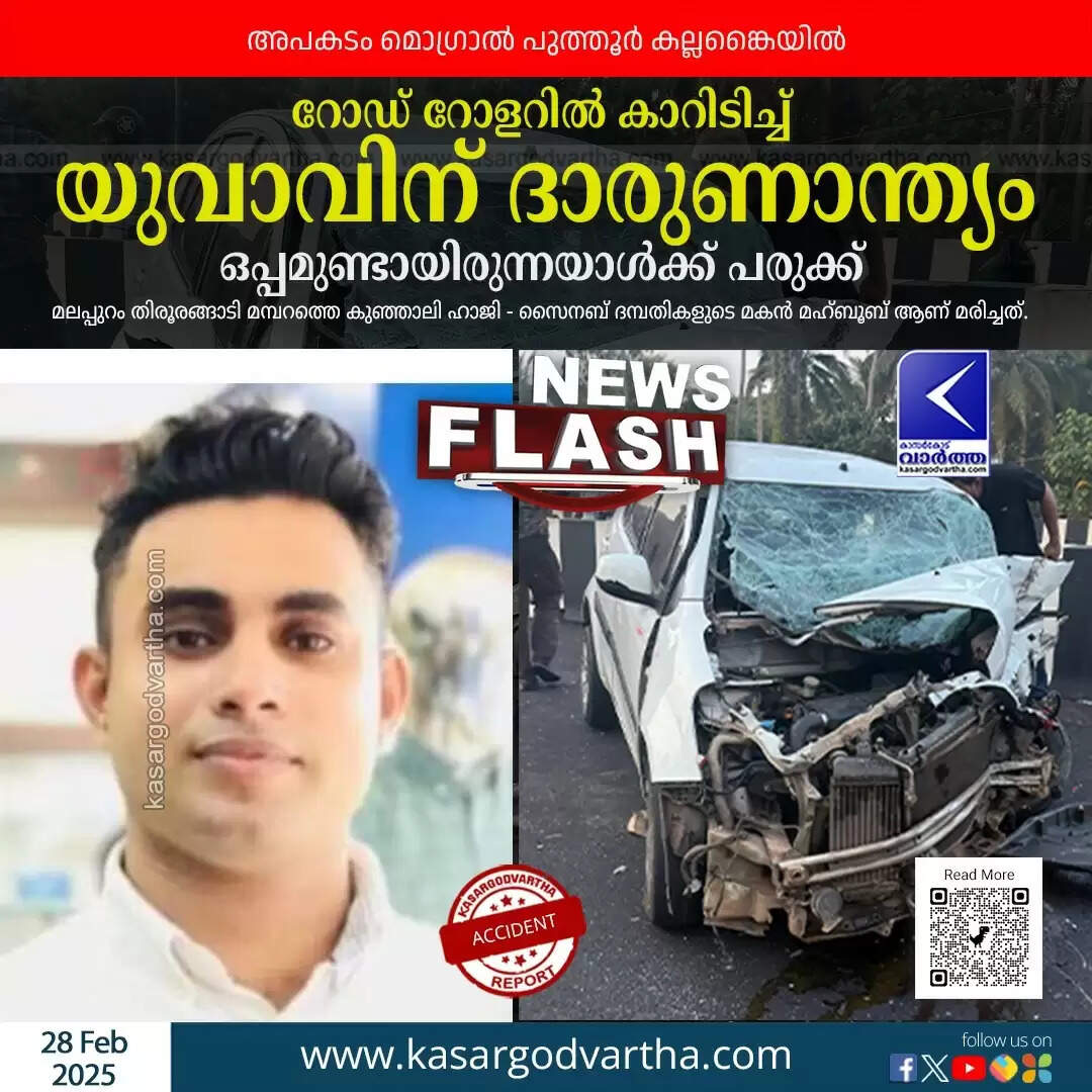 Young man from Malappuram died in a car accident involving a road roller in Mogral Puthur, Kasargod. His friend was injured and hospitalized. The accident occurred on the national highway early Friday morning.