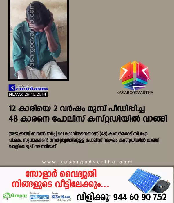 ഈ മാസം 20നാണ് പ്രതി ജില്ലാ കോടതിയില് കീഴടങ്ങിയത്. 2012 മെയ് 18നാണ് ഗോവിന്ദനെതിരെ കാസര്കോട് ടൗണ് പോലീസ് കേസ് രജിസ്റ്റര് ചെയ്തത്. കേസില് ഈയാഴ്ചതന്നെ കുറ്റപത്രം സമര്പിക്കുമെന്ന് പോലീസ് അറിയിച്ചു. ചൈല്ഡ്ലൈന് അധികൃതര് നല്കിയ വിവരത്തിന്റെ അടിസ്ഥാനത്തിലാണ് പോലീസ് കേസെടുത്തത്. നേരത്തെ ഒരു യുവതിക്കൊപ്പം ഒളിച്ചോടിയ ഗോവിന്ദന് പിന്നീട് മൂന്ന് മക്കളുടെ മാതാവിനൊപ്പമാണ് താമസിച്ചുവന്നത്. ഇതിനിടയിലാണ് 12 കാരിയെ പീഡിപ്പിച്ചത്.