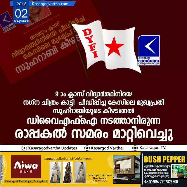 9 ാം ക്ലാസ് വിദ്യാര്ത്ഥിനിയെ നഗ്ന ചിത്രം കാട്ടി പീഡിപ്പിച്ച കേസിലെ മുഖ്യപ്രതി സുഹ്റാബിയുടെ കീഴടങ്ങല്: ഡിവൈഎഫ്ഐ നടത്താനിരുന്ന രാപ്പകല് സമരം മാറ്റിവെച്ചു