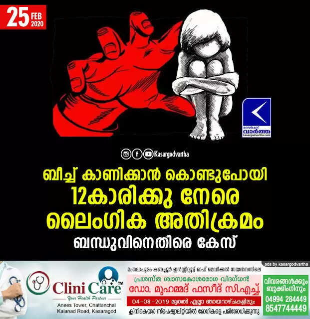 കാസര്‍കോട്: (www.kasargodvartha.com 25.02.2020) ബീച്ച് കാണിക്കാന്‍ കൊണ്ടുപോയി 12കാരിക്കു നേരെ ലൈംഗിക അതിക്രമം നടത്തിയെന്ന പരാതിയില്‍ ബന്ധുവിനെതിരെ പോലീസ് കേസെടുത്തു. 2019 ഒക്ടോബര്‍ 30നാണ് സംഭവം. കുട്ടിയെ ബീച്ച് കാണിക്കാനെന്ന് പറഞ്ഞ് വൈകിട്ടോടെ ബന്ധു കൂട്ടിക്കൊണ്ടുപോവുകയും തുടര്‍ന്ന് ലൈംഗികമായി അതിക്രമം നടത്തുകയുമായിരുന്നു.