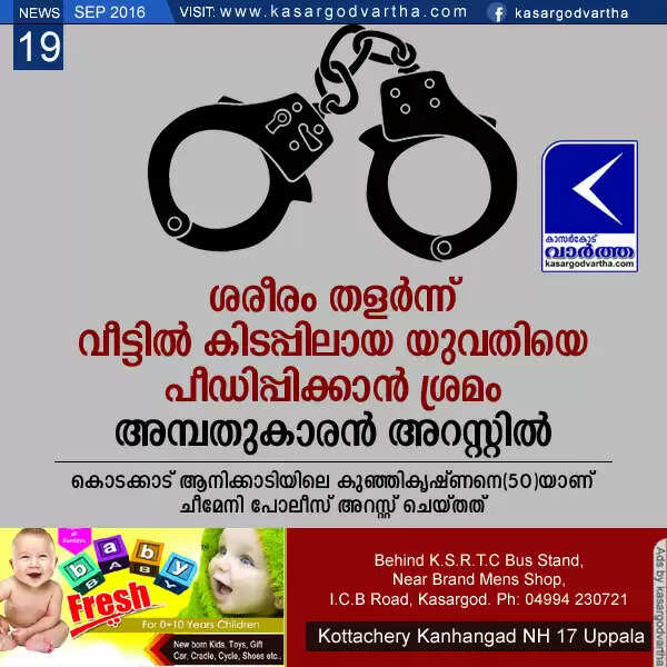 ചീമേനി: (www.kasargodvartha.com 19/09/2016) ശരീരം തളര്ന്ന് വീട്ടില് കിടപ്പിലായ യുവതിയെ പീഡിപ്പിക്കാന് ശ്രമിച്ച കേസില് പ്രതിയായ അമ്പതുകാരനെ പോലീസ് അറസ്റ്റ് ചെയ്തു. കൊടക്കാട് ആനിക്കാടിയിലെ കുഞ്ഞികൃഷ്ണനെ(50)യാണ് ചീമേനി പോലീസ് അറസ്റ്റ് ചെയ്തത്.