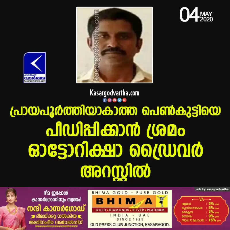 പ്രായപൂര്ത്തിയാകാത്ത പെണ്കുട്ടിയെ പീഡിപ്പിക്കാന് ശ്രമം; ഓട്ടോറിക്ഷാ ഡ്രൈവര് അറസ്റ്റില്