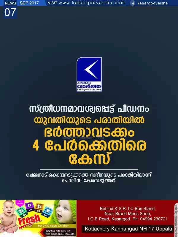 ബദിയടുക്ക: (www.kasargodvartha.com 07.09.2017) സ്ത്രീധനമാവശ്യപ്പെട്ട് പീഡിപ്പിക്കുന്നുവെന്ന യുവതിയുടെ പരാതിയില് ഭര്ത്താവടക്കം നാലു പേര്ക്കെതിരെ പോലീസ് കേസെടുത്തു. ചെമ്മനാട് കൊമ്പനടുക്കത്തെ സറീന (21)യാണ് പരാതിയുമായി പോലീസിലെത്തിയത്.