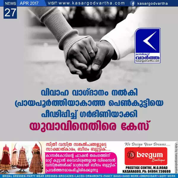 വിവാഹ വാഗ്ദാനം നല്കി പ്രായപൂര്ത്തിയാകാത്ത പെണ്കുട്ടിയെ പീഢിപ്പിച്ച് ഗര്ഭിണിയാക്കി; യുവാവിനെതിരെ കേസ്