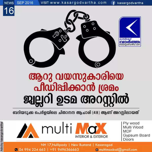 Keywords: Badiyadukka, Arrest, Kasaragod, Molestation-attempt, Molesting attempt: Jewellery owner held