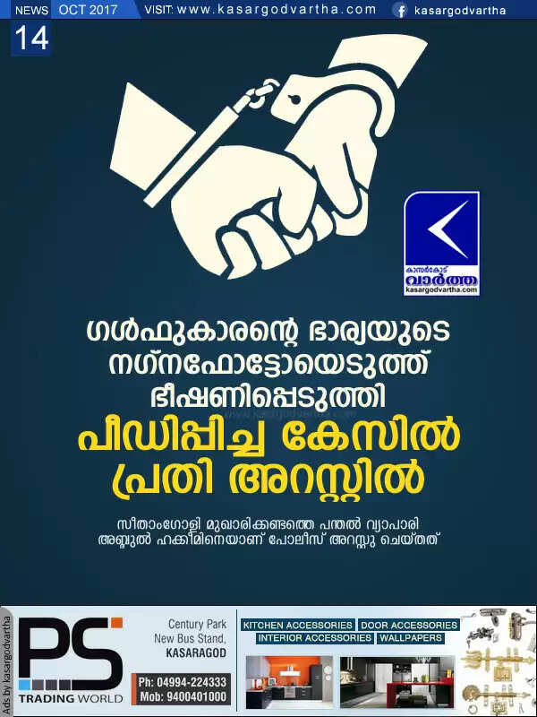 കുമ്പള: (www.kasargodvartha.com 14.10.2017) ഗള്ഫുകാരന്റെ ഭാര്യയുടെ നഗ്നഫോട്ടോയെടുത്ത് ഭീഷണിപ്പെടുത്തി പീഡിപ്പിച്ച കേസില് പ്രതിയെ പോലീസ് അറസ്റ്റു ചെയ്തു. സീതാംഗോളി മുഖാരിക്കണ്ടത്തെ പന്തല് വ്യാപാരി അബ്ദുല് ഹക്കീ(43) മിനെയാണ് കുമ്പള സി.ഐ. വി.വി മനോജിന്റെ നേതൃത്വത്തിലുള്ള പോലീസ് സംഘം അറസ്റ്റു ചെയ്തത്.