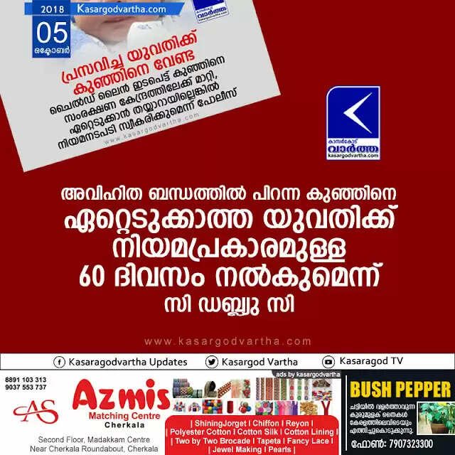 അവിഹിത ബന്ധത്തില് പിറന്ന കുഞ്ഞിനെ ഏറ്റെടുക്കാത്ത യുവതിക്ക് നിയമപ്രകാരമുള്ള 60 ദിവസം നല്കുമെന്ന് സി ഡബ്ല്യു സി