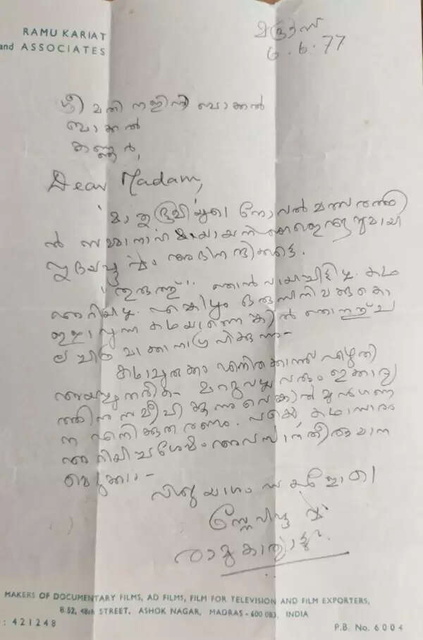 ബേക്കല് കോട്ട പശ്ചാതലമായി നളിനി ബേക്കല് രചിച്ച നോവല് 'തുരുത്ത്' സിനിമയാക്കാനുള്ള അവകാശത്തിനായ് രാമൂ കാര്യാട്ട് നളിനി ബേക്കലിന് കത്തെഴുതിയിരുന്നു. എന്നാല് ഇതിന് മറുപടി നല്കുന്നതിന് മുന്നെ അദ്ദേഹം വിടവാങ്ങുകയായിരുന്നു. രാമു കാര്യട്ട് നളിനിക്ക് എഴുതിയ കത്ത് ഇപ്പോഴും നളിനി സൂക്ഷിച്ചു വെച്ചിട്ടുണ്ട്. ചെമ്മീനിനു ശേഷം കര്ണാടകയില് 'മലങ്കാറ്റ്' എന്ന സിനിമയുടെ ഷൂട്ടിങ്ങിനിടെ ആയിരുന്നു രാമൂ കാര്യാട്ട് നളിനിക്ക് കത്ത് അയച്ചിരുന്നത്. മാസങ്ങള്ക്ക് ശേഷം രാമൂ കാര്യാട്ട് മരിച്ചു. പിന്നീട് 'തുരുത്ത്' സിനിമയാക്കുന്നതിന് വേണ്ടി തോപ്പില് ഭാസി തിരക്കഥയും, ഹരിഹരന് സംവിധാനനേത്രത്വവും ഏറ്റെടുത്തുവെങ്കിലും പൂര്ത്തികരിക്കാന് സാധിച്ചില്ല.