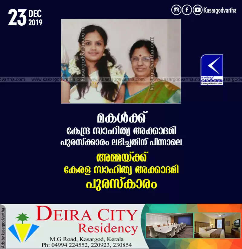 മകള്ക്ക് കേന്ദ്ര സാഹിത്യ അക്കാദമി പുരസ്ക്കാരം ലഭിച്ചതിന് പിന്നാലെ അമ്മയ്ക്ക് കേരള സാഹിത്യ അക്കാദമി പുരസ്കാരം