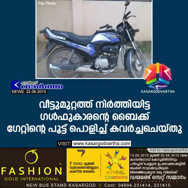 വീട്ടുമുറ്റത്ത് നിര്ത്തിയിട്ട ഗള്ഫുകാരന്റെ ബൈക്ക് ഗേറ്റിന്റെ പൂട്ട് പൊളിച്ച് കവര്ച്ചചെയ്തു