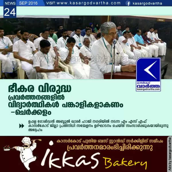 ഉപ്പള: (www.kasargodvartha.com 24/09/2016) രാജ്യത്ത് അനുദിനം വര്ധിച്ചു കൊണ്ടിരിക്കുന്ന ഭീകരവാദ വിരുദ്ധ പ്രവര്ത്തനങ്ങളെ നേരിടാന് വിദ്യാര്ത്ഥികള് തയ്യാറാവണമെന്ന് മുസ്ലിം ലീഗ് ജില്ലാ പ്രസിഡന്റ് ചെര്ക്കളം അബ്ദുല്ല ആവശ്യപ്പെട്ടു. ഉപ്പള ഗോള്ഡന് അബ്ദുല് ഖാദര് ഹാജി നഗരിയില് നടന്ന എം എസ് എഫ് കാസര്കോട് ജില്ലാ പ്രതിനിധി സമ്മേളനം ഉദ്ഘാടനം ചെയ്ത് സംസാരിക്കുകയായിരുന്നു അദ്ദേഹം.