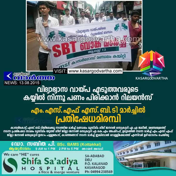 കാസര്കോട്ട് എസ്.ബി.ടിയിലേക്കു നടത്തിയ മാര്ച്ച് മണ്ഡലം മുസ്്ലിം ലീഗ് ജനറല് സെക്രട്ടറി എ.എ ജലീല് ഉദ്ഘാടനം ചെയ്തു. എം.എസ്.എഫ് മണ്ഡലം പ്രസിഡന്റ് അനസ് എതിര്ത്തോട് അധ്യക്ഷത വഹിച്ചു.നവാസ് കുഞ്ചാര് സ്വാഗതം പറഞ്ഞു. ഹാഷിം ബംബ്രാണി, സഅദ് ബാങ്കോട്, അഷ്റഫ് എടനീര്, ഹാരിസ് പട്ടേല്, അസര് എതിര്ത്തോട്, സാബിത്ത് ബിസി റോഡ്, നിസാം ഹിദായത്ത് നഗര്, സലാം ബെളിഞ്ച, മജീദ് ബെളിഞ്ച, തബ്ശീര് സന്തോഷ്നഗര്, റഫീഖ് വിദ്യാനഗര്, അന്സാഫ് കുന്നില്, ഷാനിഫ് നെല്ലിക്കട്ട, ശഫീഖ് തുരുത്തി, നൗഫല് കുമ്പഡാജെ, ഖലീല് തുരുത്തി, സാഇദ് പടുവടുക്കം, സക്കീര് ബാങ്കോട്, സുനൈഫ് തെരുവത്ത്, ഫയാസ് നേതൃത്വം നല്കി.