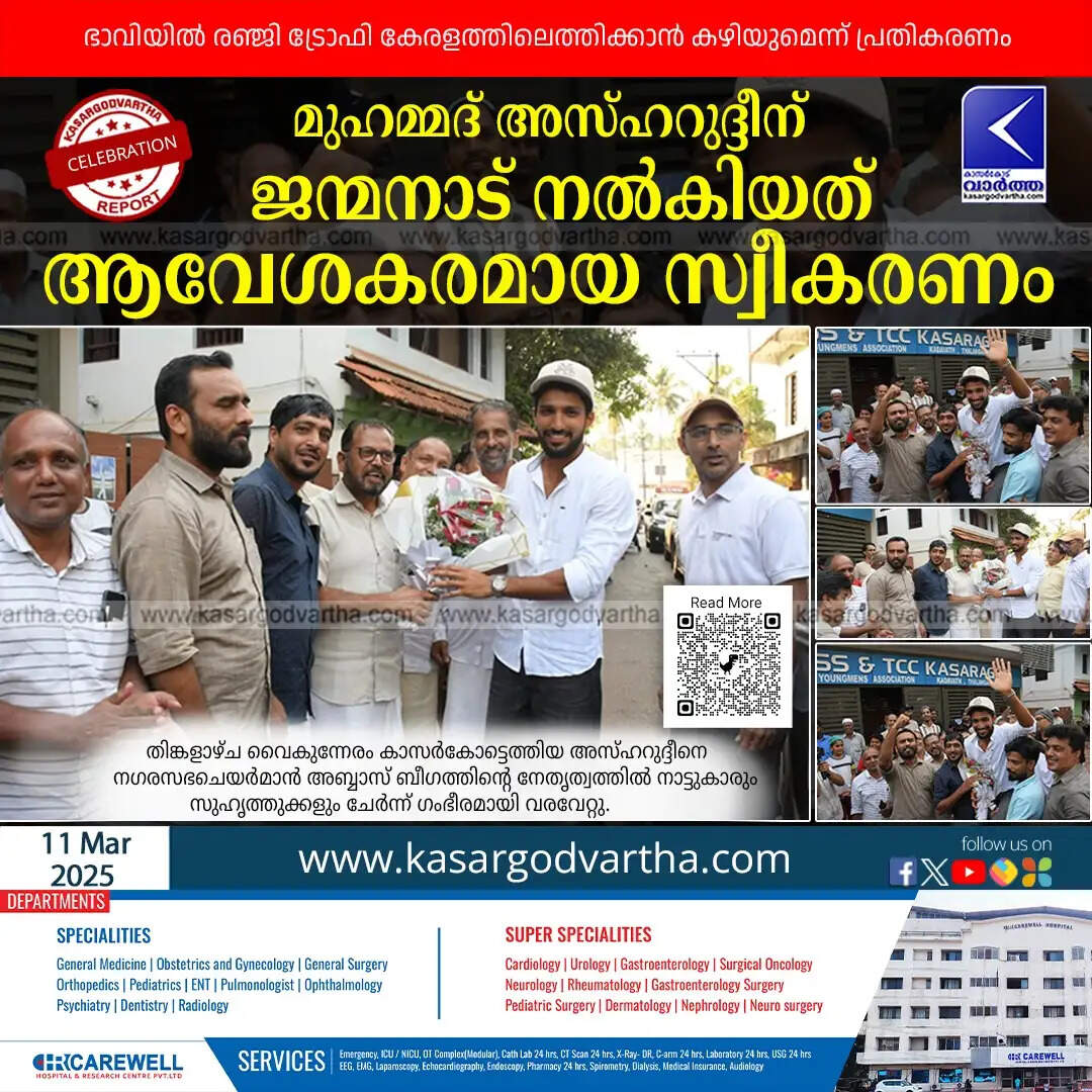 തുറന്ന വാഹനത്തിൽ നിരവധി വാഹനങ്ങളുടെ അകമ്പടിയോടെയാണ് അസ്ഹറുദ്ദീനെ തളങ്കരയിലേക്ക് ആനയിച്ചത്. കേരളത്തിൻ്റെ അഭിമാനകരമായ നേട്ടത്തിൽ പങ്കാളിയാകാൻ കഴിഞ്ഞതിൽ ഏറെ സന്തോഷവാനാണെന്നും രഞ്ജി ട്രോഫിയിൽ മാത്രമല്ല, രാജ്യത്തെവിടെയും കേരള ക്രികറ്റ് ഇന്ന് ശ്രദ്ധിക്കപ്പെടുന്ന ശക്തിയായി മാറിയിട്ടുണ്ടെന്നും അസ്ഹറുദ്ദീൻ പ്രതികരിച്ചു. വ്യക്തിഗത നേട്ടത്തേക്കാൾ ടീമിന്റെ വിജയത്തിനാണ് പ്രാധാന്യം നൽകുന്നതെന്നും കൂട്ടായ പരിശ്രമമാണ് ഫൈനൽ പ്രവേശനത്തിന് പിന്നിലെന്നും അദ്ദേഹം കൂട്ടിച്ചേർത്തു.