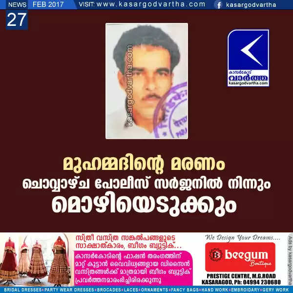 മുഹമ്മദിന്റെ മരണം: ചൊവ്വാഴ്ച പോലീസ് സര്‍ജനില്‍ നിന്നും മൊഴിയെടുക്കും