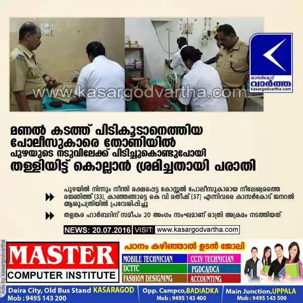 കാസര്കോട്: (www.kasargodvartha.com 20/07/2016) മണല് കടത്ത് പിടികൂടാന് പോയ കാസര്കോട് തീരദേശ പോലീസിലെ രണ്ട് പോലീസ് ഉദ്യോഗസ്ഥരെ തോണിയില് ബലമായി പിടിച്ചുകൊണ്ടുപോയി പുഴയുടെ നടുവില് തള്ളിയിട്ട് കൊല്ലാന് ശ്രമിച്ചതായി പരാതി. തളങ്കര ഹാര്ബറിന് സമീപം 20 അംഗം സംഘമാണ് രാത്രി അക്രമം നടത്തിയത്. പുഴയില് നിന്നും നീന്തി രക്ഷപ്പെട്ട കോസ്റ്റല് പോലീസുകാരായ നീലേശ്വരത്തെ രജ്ഞിത്ത് (33), കാഞ്ഞങ്ങാട്ടെ കെ വി രതീഷ് (37) എന്നിവരെ കാസര്കോട് ജനറല് ആശുപത്രിയില് പ്രവേശിപ്പിച്ചു.