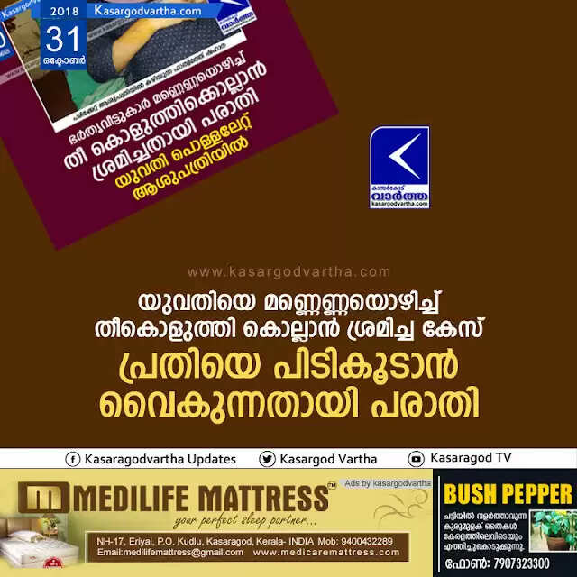യുവതിയെ മണ്ണെണ്ണയൊഴിച്ച് തീകൊളുത്തി കൊല്ലാന് ശ്രമിച്ച കേസ്; പ്രതിയെ പിടികൂടാന് വൈകുന്നതായി പരാതി