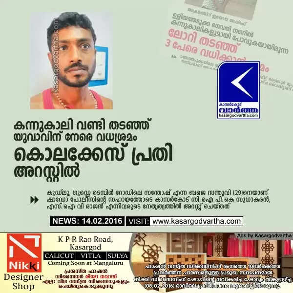 കാസര്കോട്: (www.kasargodvartha.com 14/02/2016) കന്നുകാലികളെ കൊണ്ടുപോവുകയായിരുന്ന പിക്കപ്പ് വാന് തടഞ്ഞ് യുവാവിനെ വധിക്കാന് ശ്രമിച്ച സംഭവത്തില് കൊലക്കേസ് പ്രതിയെ പോലീസ് അറസ്റ്റ് ചെയ്തു. കുഡ്ലു, ഗുഡ്ഡെ ടെമ്പിള് റോഡിലെ സന്തോഷ് എന്ന ബജെ സന്തുവി (29)നെയാണ് ഷാഡോ പോലീസിന്റെ സഹായത്തോടെ കാസര്കോട് സി.ഐ പി.കെ സുധാകരന്, എസ്.ഐ വി രാജന് എന്നിവരുടെ നേതൃത്വത്തില് അറസ്റ്റ് ചെയ്തത്.