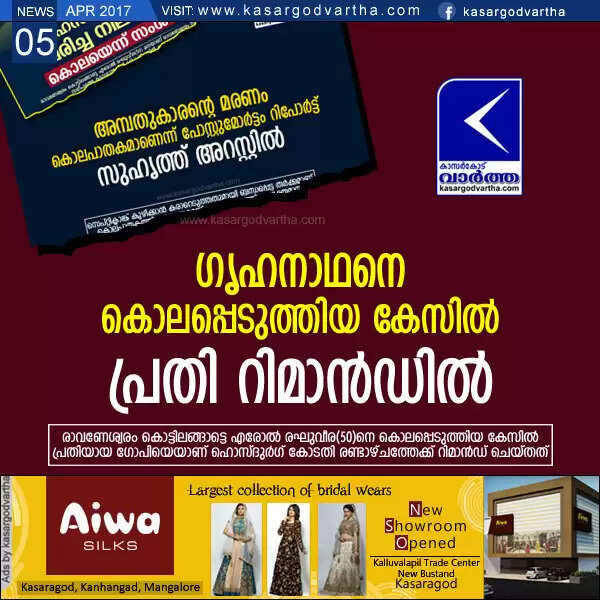കാഞ്ഞങ്ങാട്: (www.kasargodvartha.com 05.04.2017) ഗൃഹനാഥനെ തോര്‍ത്ത്മുണ്ട് കഴുത്തില്‍ കുരുക്കി കൊലപ്പെടുത്തിയ കേസില്‍ അറസ്റ്റിലായ പ്രതിയെ കോടതി റിമാന്‍ഡ് ചെയ്തു. രാവണേശ്വരം കൊട്ടിലങ്ങാട്ടെ എരോല്‍ രഘുവീര(50)നെ കൊലപ്പെടുത്തിയ കേസില്‍ പ്രതിയായ ഗോപിയെയാണ് ഹൊസ്ദുര്‍ഗ് കോടതി രണ്ടാഴ്ചത്തേക്ക് റിമാന്‍ഡ് ചെയ്തത്.
