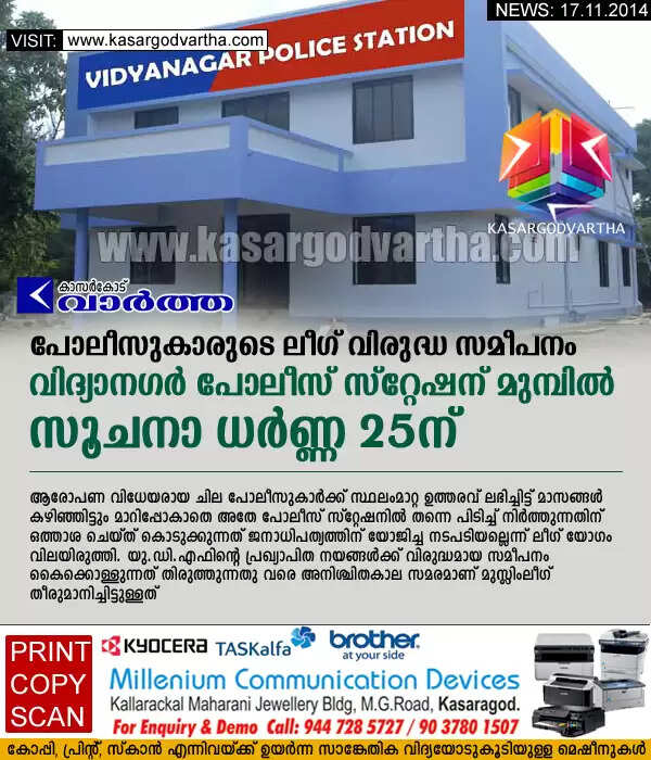 പോലീസുകാരുടെ ലീഗ് വിരുദ്ധ സമീപനം: വിദ്യാനഗര് പോലീസ് സ്റ്റേഷന് മുമ്പില് സൂചനാ ധര്ണ്ണ 25ന്