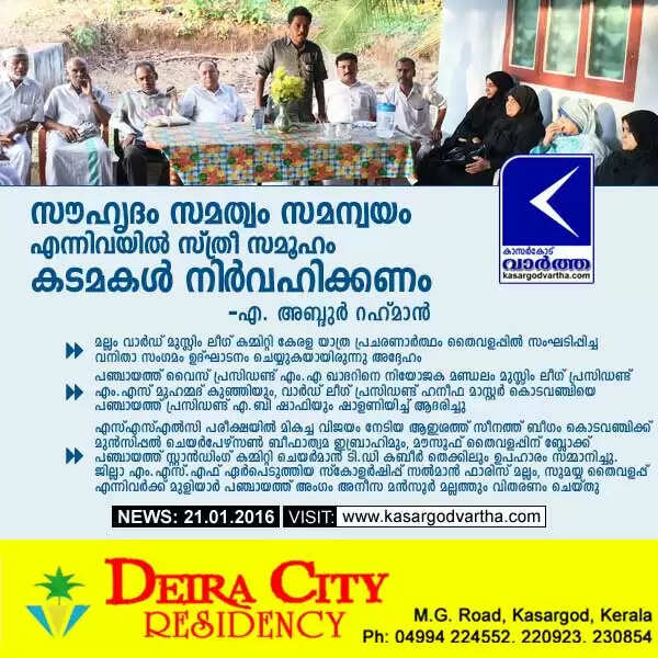 മുളിയാര്: (www.kasargodvartha.com 21/01/2016) അസഹിഷ്ണുതയും സാമൂഹ്യ ചേരിതിരിവും സൃഷ്ടിച്ച് നാടിനെ കലുശിതമാക്കി രാഷ്ട്രീയ നേട്ടം കൊയ്യാന് ആസൂത്രിത നീക്കം നടന്നു വരുന്ന പുതിയ രാഷ്ട്രീയ സാഹചര്യത്തില് സൗഹൃദത്തിന്റെയും സമത്വത്തിന്റെയും സമന്വയത്തിന്റെയും പാതയില് കുടുംബത്തേയും, സമൂഹത്തേയും വഴി നടത്തുന്നതില് സ്ത്രീ സമൂഹം കടമകള് നിര്വഹിക്കണമെന്ന് മുസ്ലിം ലീഗ് ജില്ലാ ട്രഷറര് എ. അബ്ദുര് റഹ് മാന് അഭിപ്രായപ്പെട്ടു. മല്ലംവാര്ഡ് മുസ്ലിം ലീഗ് കമ്മിറ്റി കേരള യാത്ര പ്രചരണാര്ത്ഥം തൈവളപ്പില് സംഘടിപ്പിച്ച വനിതാ സംഗമം ഉദ്ഘാടനം ചെയ്യുകയായിരുന്നു അദ്ദേഹം.
