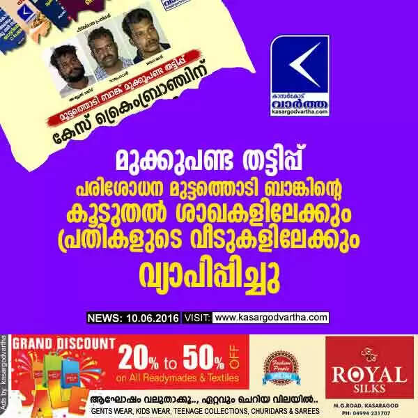 കാസര്കോട്: (www.kasargodvartha.com 10.06.2016) മുട്ടത്തൊടി സര്വ്വീസ് സഹകരണബാങ്കിന്റെ വിദ്യാനഗര്, നായന്മാര്മൂല ശാഖകളില് മുക്കുപണ്ടങ്ങള് പണയം വെച്ച് അഞ്ചുകോടിയോളം രൂപ തട്ടിയെടുത്ത കേസില് പോലീസും സഹകരണവകുപ്പും പരിശോധന ബാങ്കിന്റെ കൂടുതല് ശാഖകളിലേക്കും പ്രതികളുടെ വീടുകളിലേക്കും വ്യാപിപ്പിച്ചു.