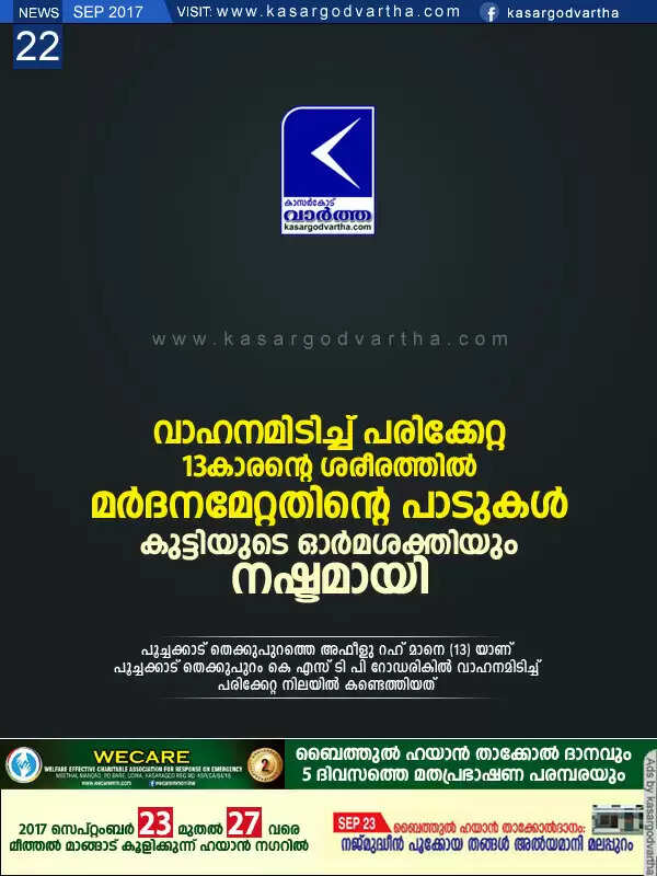 ബേക്കല്: (www.kasargodvartha.com 22/09/2017) വാഹനമിടിച്ച് പരിക്കേറ്റ നിലയില് കണ്ടെത്തിയ 13കാരന്റെ ശരീരത്തില് മര്ദനമേറ്റതിന്റെ പാടുകള്. അതീവ ഗുരുതരാവസ്ഥയിലായ കുട്ടിയുടെ ഓര്മശക്തിയും നഷ്ടപ്പെട്ടു. പൂച്ചക്കാട് തെക്കുപുറത്തെ സുഹ്റാ മന്സിലില് നസീമയുടെ മകന് അഫീളു റഹ് മാനെ (13) യാണ് പൂച്ചക്കാട് തെക്കുപുറം കെ എസ് ടി പി റോഡരികില് വാഹനമിടിച്ച് പരിക്കേറ്റ നിലയില് കണ്ടെത്തിയത്.