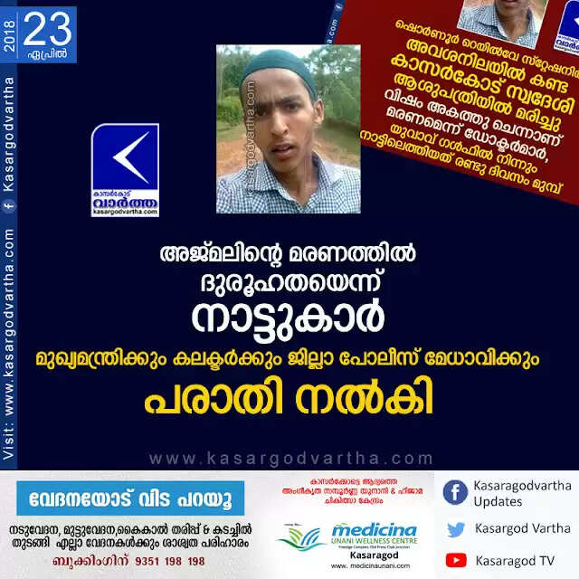 കാസര്‍കോട്; (www.kasargodvartha.com 23.04.2018) ഷൊര്‍ണൂര്‍ റെയില്‍വേ സ്റ്റേഷനില്‍ അവശനിലയില്‍ കാണപ്പെടുകയും പിന്നീട് ആശുപത്രിയില്‍ വെച്ച് മരണപ്പെടുകയും ചെയ്ത ചെമ്മനാട് കൊമ്പനടുക്കം ആലിച്ചേരിയിലെ മുഹമ്മദ് അജ്മലിന്റെ മരണത്തില്‍ ദുരൂഹതയെന്ന് നാട്ടുകാര്‍. ഇതു സംബന്ധിച്ച് മുഖ്യമന്ത്രി പിണറായി വിജയനും ജില്ലാ കലക്ടര്‍ ജീവന്‍ ബാബുവിനും ജില്ലാ പോലീസ് മേധാവി കെ ജി സൈമണിനും തഹസില്‍ദാര്‍ക്കും പരാതി നല്‍കി. പൊതുപ്രവര്‍ത്തകരായ ബാഷ ചെമ്മനാട്, അബ്ദുല്‍ഖാദര്‍ ചെമ്മനാട് എന്നിവരാണ് പരാതി നല്‍കിയത്.