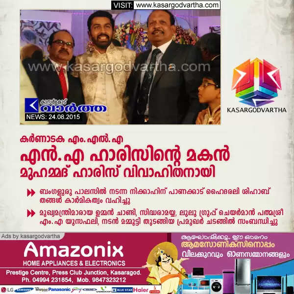 ബംഗളൂരു: (www.kasargodvartha.com 24/08/2015) കര്‍ണാടക എം.എല്‍.എയും നാലപ്പാട് ഗ്രൂപ്പ് മാനേജിംഗ് ഡയറക്ടറും കോണ്‍ഗ്രസ് നേതാവുമായ എന്‍.എ. ഹാരിസ് നാലപ്പാടിന്റെയും സുഹറ ഹാരിസിന്റേയും മകന്‍ മുഹമ്മദ് ഹാരിസ് നാലപ്പാട് വിവാഹിതനായി. വിവാഹ ചടങ്ങില്‍ കേരള മുഖ്യമന്ത്രി ഉമ്മന്‍ ചാണ്ടി, മുസ്ലിം ലീഗ് സംസ്ഥാന അധ്യക്ഷന്‍ പാണക്കാട് ഹൈദരലി ശിഹാബ് തങ്ങളടക്കം നിരവധി പ്രമുഖര്‍ പങ്കെടുത്തു. ഹൈദരാബാദ് കോയ ആന്‍ഡ് കമ്പനി കണ്‍സ്ട്രക്ഷന്‍ ലിമിറ്റഡ് ചെയര്‍മാന്‍ ടി.കെ. സലീമിന്റേയും നൗഷീന്‍ സലീമിന്റേയും മകള്‍ സംറിന്‍ സലീമാണ് വധു. ബംഗളൂരു പാലസില്‍ നടന്ന വിവാഹചടങ്ങില്‍ പാണക്കാട് ഹൈദരലി ശിഹാബ് തങ്ങളാണ് നിക്കാഹിന് കാര്‍മികത്വം വഹിച്ചത്.