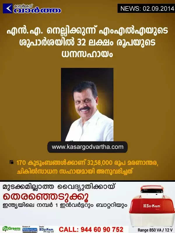 എന്.എ. നെല്ലിക്കുന്ന് എംഎല്എയുടെ ശുപാര്ശയില് 32 ലക്ഷം രൂപയുടെ ധനസഹായം