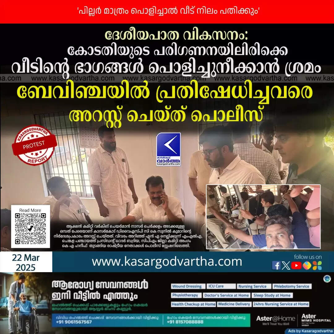 Protest | ദേശീയപാത വികസനം: കോടതിയുടെ പരിഗണനയിലിരിക്കെ വീടിന്റെ ഭാഗങ്ങൾ പൊളിച്ചുനീക്കാൻ ശ്രമം; ബേവിഞ്ചയിൽ പ്രതിഷേധിച്ചവരെ അറസ്റ്റ് ചെയ്ത് പൊലീസ്