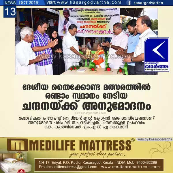 ചന്ദനക്ക് എം.എല്.എ ഉപഹാരം കൈമാറി. പഞ്ചായത്ത് അംഗം അനീസ മന്സൂര് മല്ലത്ത്, ഷരീഫ് ദാമോദരന് മാസ്റ്റര്, ഗണേഷ് നായക്, സാവിത്രി രാഘവന്, ശോഭന എന്നിവര് പ്രസംഗിച്ചു. പരിശീലകന് മുരളി നന്ദി പറഞ്ഞു.