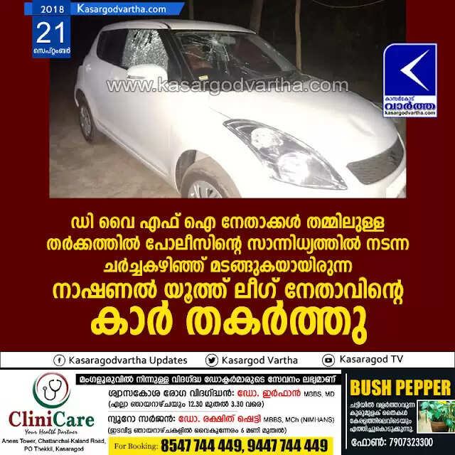 ഡി വൈ എഫ് ഐ നേതാക്കള്‍ തമ്മിലുള്ള തര്‍ക്കത്തില്‍ പോലീസിന്റെ സാന്നിധ്യത്തില്‍ നടന്ന ചര്‍ച്ചകഴിഞ്ഞ് മടങ്ങുകയായിരുന്ന നാഷണല്‍ യൂത്ത് ലീഗ് നേതാവിന്റെ കാര്‍ തകര്‍ത്തു