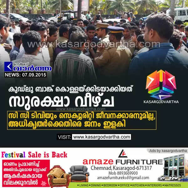 കുഡ്ലു ബാങ്ക് കൊള്ളയ്ക്കിടയാക്കിയത് സുരക്ഷാ വീഴ്ച; സി സി ടിവിയും സെക്യൂരിറ്റി ജീവനക്കാരനുമില്ല, അധികൃതര്ക്കെതിരെ ജനം ഇളകി