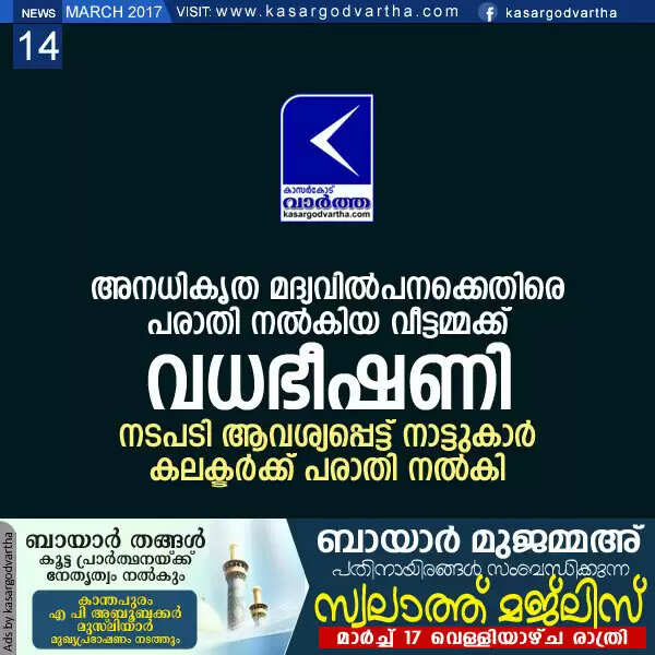 അനധികൃത മദ്യവില്പനക്കെതിരെ പരാതി നല്കിയ വീട്ടമ്മക്ക് വധഭീഷണി; നടപടി ആവശ്യപ്പെട്ട് നാട്ടുകാര് കലക്ടര്ക്ക് പരാതി നല്കി