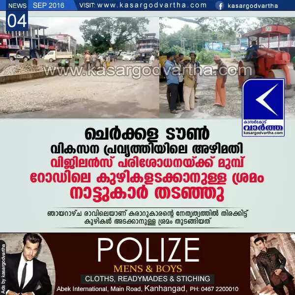 ചെര്ക്കള ടൗണ് വികസന പ്രവൃത്തിയിലെ അഴിമതി; വിജിലന്സ് പരിശോധനയ്ക്ക് മുമ്പ് റോഡിലെ കുഴികളടക്കാനുള്ള ശ്രമം നാട്ടുകാര് തടഞ്ഞു