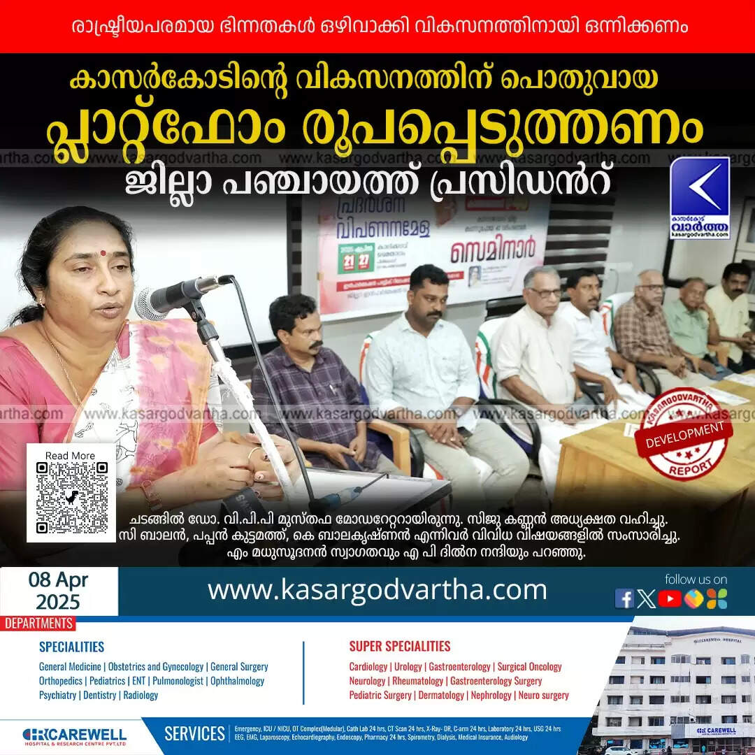 Kasaragod District Panchayat President Baby Balakrishnan emphasized the need for a common platform beyond political and sectarian differences for the district's comprehensive development at a seminar titled 'Kasaragod @ 40'. The seminar, organized by the District Information Office and Press Club, discussed the progress of Kasaragod over the past 40 years, highlighting achievements in various sectors and the impact of government schemes.