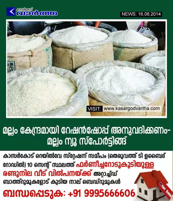 ചെര്‍ക്കള: (www.kasargodvartha.com 16.08.2014) മല്ലം, അട്ടപ്പറമ്പ്, കോളങ്കോട്, കൊളച്ചെപ്പ്, ചോക്കമൂല, മുണ്ടപ്പള്ളം, വെലിയമൂല, മജക്കാര്‍, മുഗാരിത്തോട്ടം, തുടങ്ങിയ പ്രദേശങ്ങളിലെ ഉപഭോക്താക്കള്‍ക്ക് ഗുണകരമാകുന്ന തരത്തില്‍ മല്ലം കേന്ദ്രമായി റേഷന്‍ ഷോപ് അനുവദിക്കണമെന്ന് മല്ലം ന്യൂ സ്‌പോര്‍ട്ടിങ്ങ് അടിയന്തര യോഗം ആവശ്യപ്പെട്ടു.