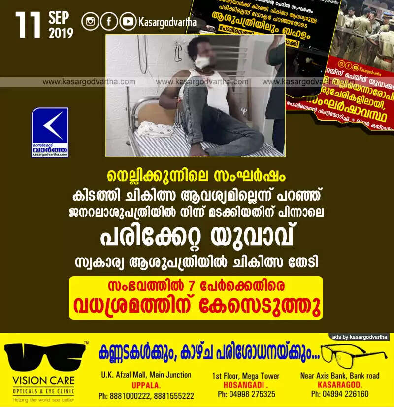നെല്ലിക്കുന്നിലെ സംഘര്ഷം: കിടത്തി ചികിത്സ ആവശ്യമില്ലെന്ന് പറഞ്ഞ് ജനറലാശുപത്രിയില് നിന്ന് മടക്കിയതിന് പിന്നാലെ പരിക്കേറ്റ യുവാവ് സ്വകാര്യ ആശുപത്രിയില് ചികിത്സ തേടി, സംഭവത്തില് 7 പേര്ക്കെതിരെ വധശ്രമത്തിന് കേസെടുത്തു