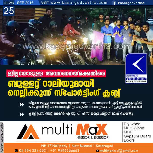 ജില്ലയോടുള്ള അവഗണനയ്ക്കെതിരെ ബുള്ളറ്റ് റാലിയുമായി നെല്ലിക്കുന്ന് സ്പോര്ട്ടിംഗ് ക്ലബ്ബ്